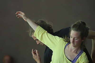Nach einem intensiven Warm Up zur Stärkung der Präsenz leiten wir thematische Bewegungsforschung an und gehen dann in eine Gruppenimprovisation über, die wir zusammen reflektieren.
